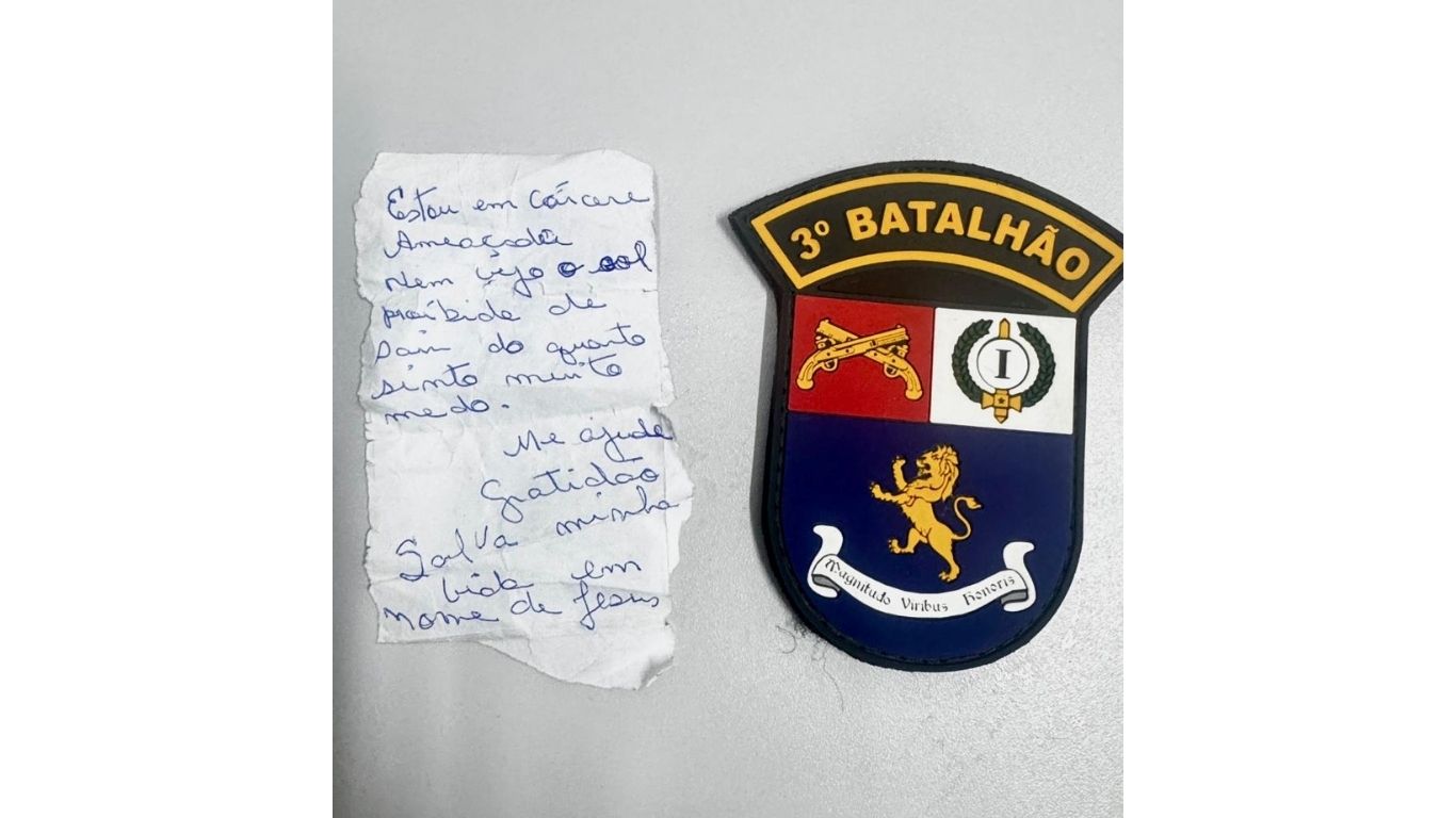 Em certo momento, um dos policiais militares observou a vítima abraçada com a testemunha e tentando colocar um papel no bolso da sua camisa, de forma discreta, que era um bilhete com pedido de socorro escrito: “Estou em cárcere e ameaçada. Nem vejo o sol. Proibida de sair do quarto. Sinto muito medo. Me ajuda. Gratidão. Salva a minha vida em nome de Jesus”.