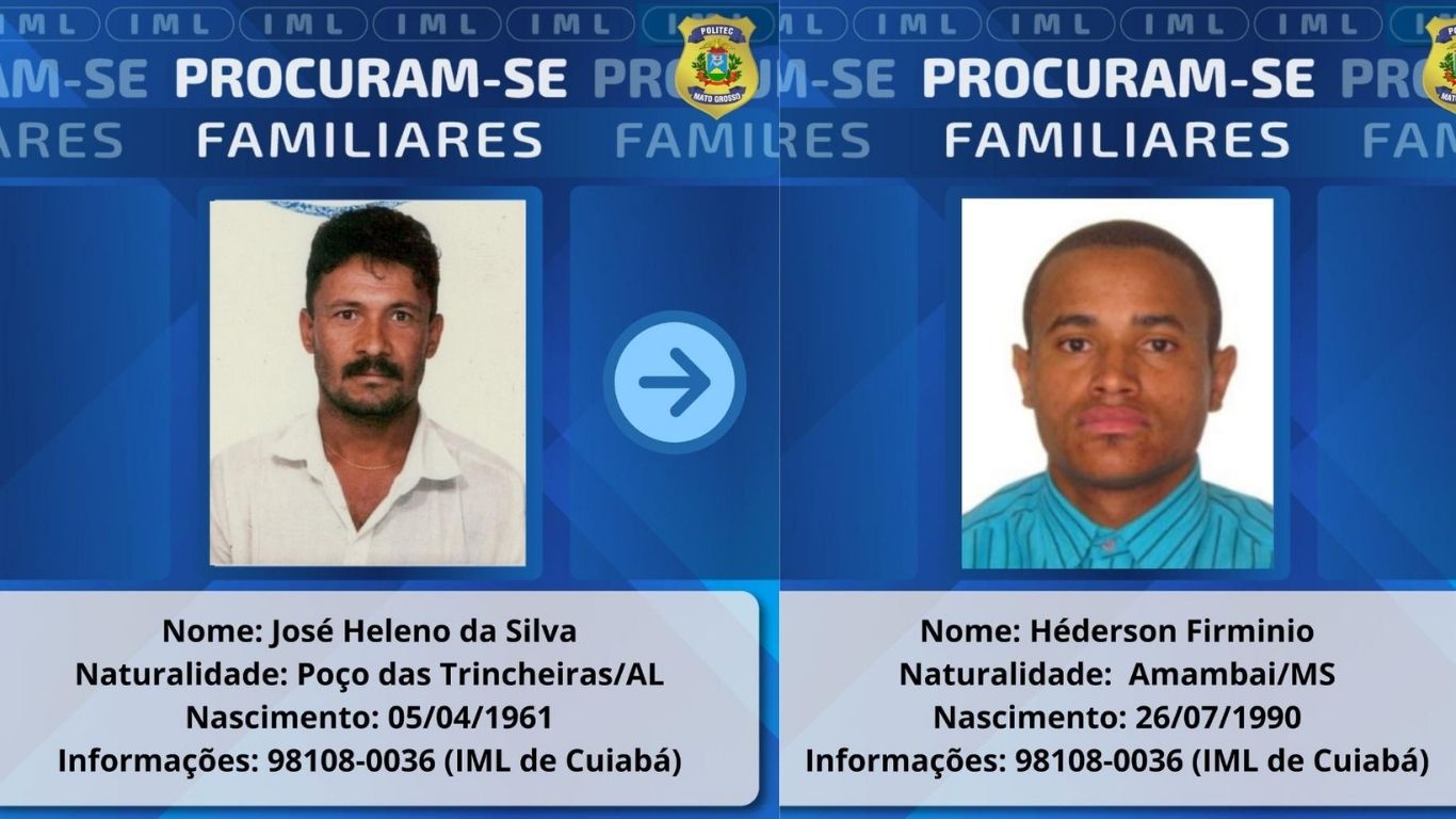A Perícia Oficial e Identificação Técnica (Politec) busca por familiares de três vítimas identificadas para a liberação dos corpos. Duas são de Cuiabá e uma, de Nova Mutum.