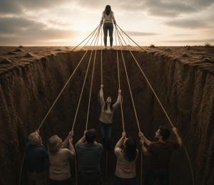 A imagem inspirada por essa reflexão, de uma filha segurando as cordas que estão amarradas à sua família, é uma metáfora perfeita para a realidade de muitos que, ao tentar crescer, se deparam com um sistema familiar que, em vez de incentivar a evolução, tenta segurar a pessoa no lugar de origem. A filha não está sendo resgatada, ela está sendo puxada de volta, não porque sua evolução seja vista como um problema, mas porque ela é, de certa forma, “proibida” de seguir em frente, como se sua responsabilidade fosse carregar os pesados fardos emocionais de sua família.